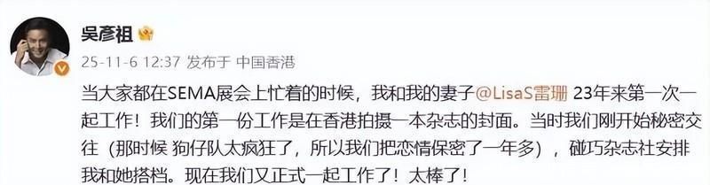 2025日下午,吴彦祖在微博上发布了一张与妻子Lisa的合影照片。这张照片是为了纪念两人相年来第一次共同参与工作项目。照片中,吴彦祖与Lisa都以素颜状态出现,背后有造型师在准备妆容。吴彦祖的眼角有皱纹,但整体状态保持较好。Lisa的皮肤显示出粗糙特征,皱纹较多,发际线后移明显,头发稀疏,看起来有秃顶迹象。她的整体外貌呈现出较为男性化的轮廓。照片发布后,迅速引发网友关注和讨论。